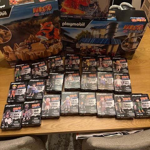 Playmobil restaurant lekesett med figurer naruto. Settet består av en liten restaurant med blått tak, skilt med japanske tegn og innredning som disk, hyller, komfyr og kjøkkenutstyr. Inne i bygningen følger det med flere små tilbehør som boller, kopper og gryte. Lekesettet inkluderer tre figurer inspirert av Naruto-universet, samt en liten hundefigur. Må hentes.