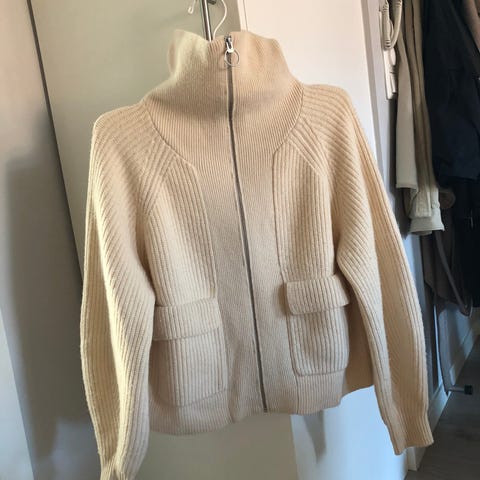 Den er brukt et par ganger, men fremstår som pent brukt. Genseren er oversized, og kan passe fra xxs-m. Det kommer an på hvordan man ønsker at den skal sitte.