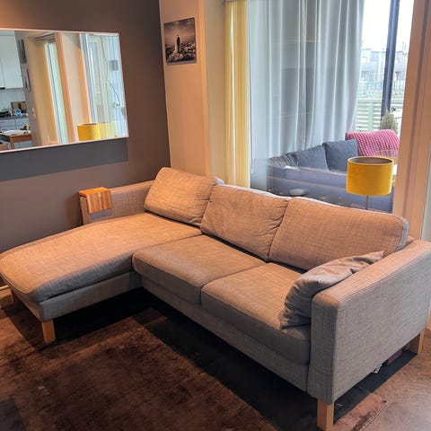 Brukt behagelig sofa brukt i tv stue. Kan sikkert puffes opp. Beige stoff. Er noen bruksflekker og nupper, men ellers hel og fin. Kan sikkert renses. Trekk på puter kan tas av og vaskes.