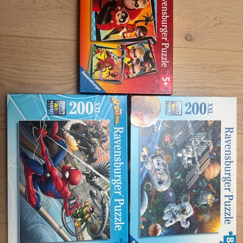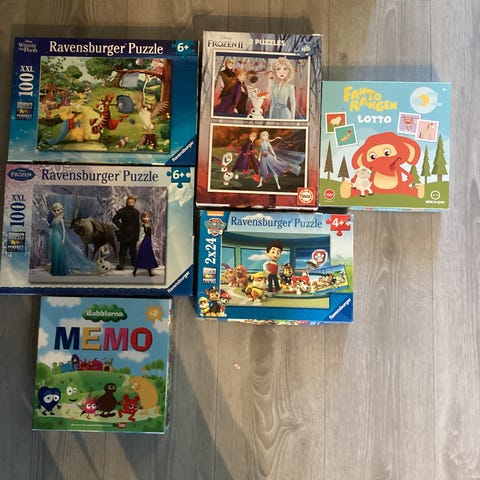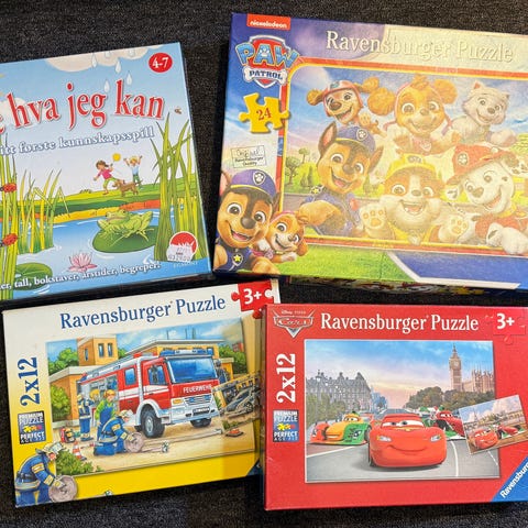 Pakken inneholder flere puslespill med motiv fra Frost, Spiderman, brannbil og Disney Biler. Puslespillene har ulike anbefalte aldersnivåer fra ca. 3 år og oppover.