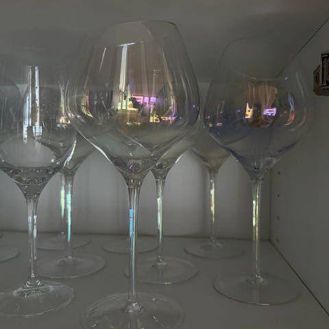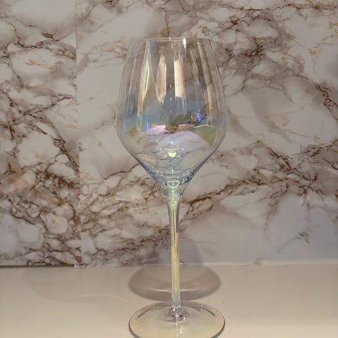 Selger flotte vinglass med iriserende/regnbuefarget metallfinish. Glassene skifter farge i lyset og er veldig dekorative på bordet – perfekte til fest, middag eller som pynt i vitrineskap.
