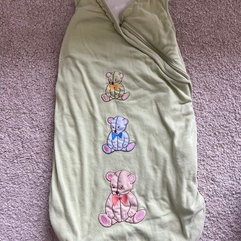 Soveposen er beige i myk bomull med quiltet struktur og trykt mønster. Modellen er ermeløs og har trykknapp på skulderen og glidelås i siden for enkel av- og påkledning. Passer til både jenter og gutter og er egnet som sovepose i seng eller vogn innendørs.