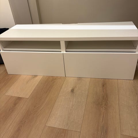Skjenken har noen flekker på innsiden av skapdørene, men ikke på utsiden. Der er små bruksmerker på skuffene, men eller framstår skjenken som fin og i god stand.