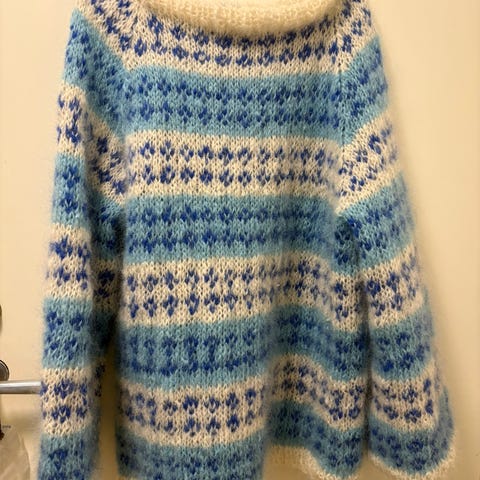 Blå og grå tykk god genser. Med til L vil jeg tro. Husker ikke garn