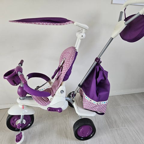 Trehjulssykkel for barn . Sykkelen har rød og blå ramme, hvitt sete og hvite håndtak. Den er utstyrt med to store bakhjul og ett forhjul, samt pedaler på forhjulet. Egnet for små barn. Må hentes