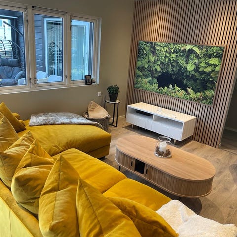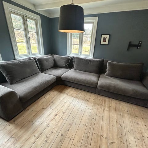 Sofaen er i blå velur/fløyel som gir et eksklusivt uttrykk og er veldig behagelig å sitte i. Perfekt for stor familie, filmkvelder eller når man har gjester. God sittekomfort og mange sitteplasser.