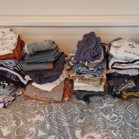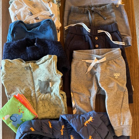 Pent brukt klespakke inkl merinoull. To små, svake flekker på ene ullbodyen (se bilder), ellers ingen flekker eller hull. Klærne er i god stand og har mye bruk igjen.