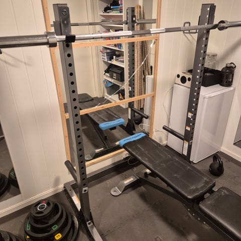 Stativ for vektstang med flere vektskiver i sort. Stativet har faste høyder for plassering av vektstang og er egnet til styrketrening som knebøy og benkpress benk, ikke inkludert ). Vektskivene har standard hull for montering på vektstang. Passer til hjemmegym eller treningsrom der det er behov for et enkelt stativ med tilhørende vekter.