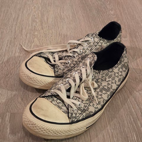 Converse All Star lave sneakers i hvit farge i størrelse 39. Klassisk modell med lerretsoverdel, snøring foran og gummisåle med mønster under. Skoene har lavt skaft og gummitå i front. Passer til hverdagsbruk og fritid.