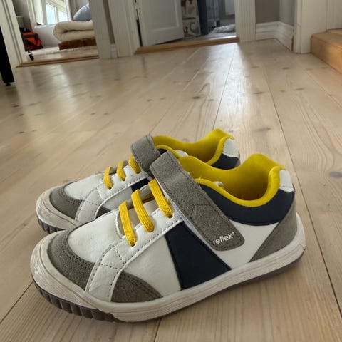 Reflex joggesko for gutt i størrelse 28. Skoene er svarte med grå detaljer og har kombinert snøring og borrelås øverst for enkel tilpasning. Overdelen er i tekstil og syntetisk materiale, med en solid yttersåle i syntetisk materiale som gir godt grep. Egnet som hverdagssko og til lek både inne og ute.