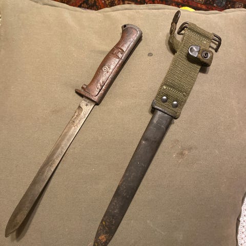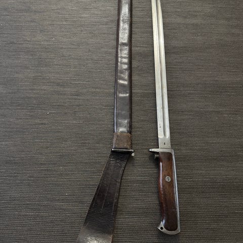 Pen US M1 karabin. Produsert av National Postal Meter. Medfølger bajonett med balg, magasintaske med to 15 skudds magasiner, pussesnor, web rem, lite glass med olje/fett. Ev. annet.
