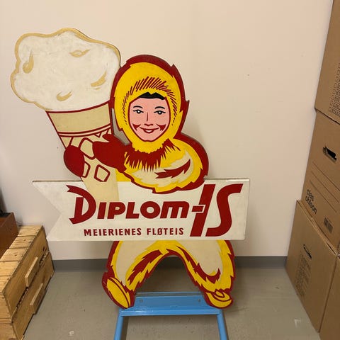 Diplom-Is samling reklameeffekter bestående av flere ulike objekter. Samlingen inkluderer to større reklameskilt med Diplom-Is-figuren og iskremmotiv, to runde isbokser på 2 liter med Diplom-Is-dekor, et sett med seks små skjeer med dekorert skaft, samt et veggtermometer med Diplom-Is-profil, ca. 50 cm langt. Egner seg som samlerobjekter eller dekor knyttet til norsk iskremhistorie og merkevaren Diplom-Is.