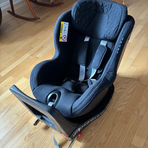 Cybex Sirona Sx2 i-size i blå farge. Barnesetet har integrert base med støtteben og er beregnet for montering bakovervendt og eventuelt forovervendt etter barnets vekt og høyde, i henhold til merkingen på setet. Setet har intern 5-punkts sele, justerbar hodestøtte og sidebeskyttelse. Stofftrekket er polstret for økt komfort for barnet. Barnesetet festes i bilen med base og isofix-fester, og har tydelige bruksanvisninger og indikatorer på siden for korrekt montering og innstilling.