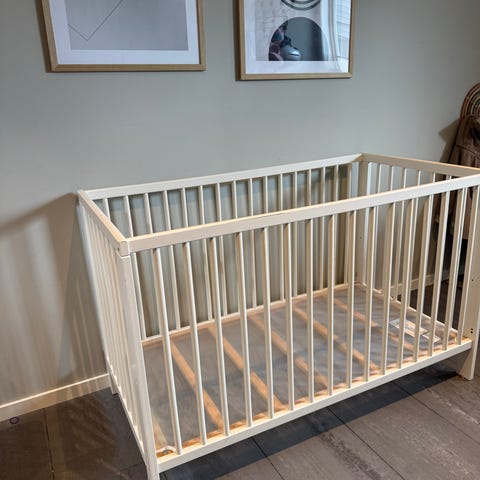 SUNDVIK sprinkelseng i hvit fra IKEA selges. 60x120 cm. Bunnen kan heves og senkes, og en av langsidene kan fjernes etter hvert som barnet vokser. Få bruksmerker. Ferdig demontert. Må hentes i Oslo. Pris: 950