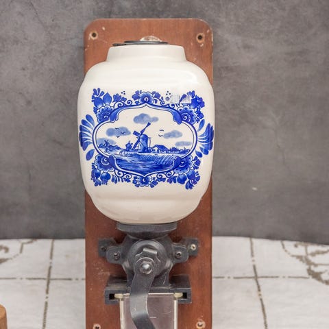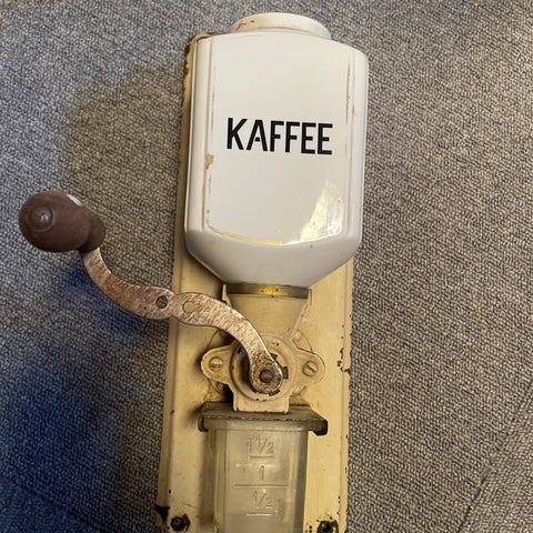 Kaffekvern som henges på veggen selges. Høyde 30 cm og bredde 12 cm.