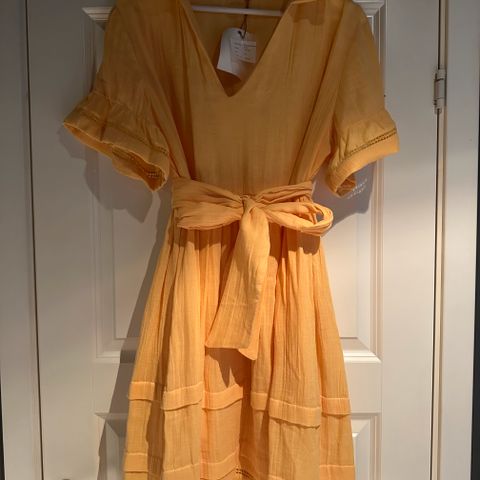Nydelig, gul kjole fra Confettibird selges. Flatterende passform og bredt, avtagbart knytebelte i livet. Skulderputer. Brukt ved én anledning.