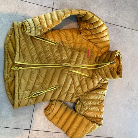 Bergans dunjakke for dame i størrelse S. Jakken er quiltet med horisontale sømmer og har hette. Fargen er rosa/ceriserosa. Modellen har frontglidelås, brystlomme med glidelås og to sidelommer med glidelås. Justering nederst på jakken for bedre passform. Egner seg som ytterjakke eller mellomlag på kjølige dager.