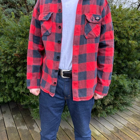 Selger en klassisk Dickies flanellskjorte i rød og sort rutete mønster (buffalo plaid).