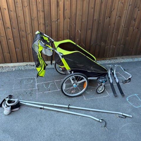 Medfølgende utstyr på bildene inkluderer stort joggehjul foran, sykkelfeste med drag og skisett med drag, som gjør at vognen kan brukes både som sykkelvogn, joggevogn og pulk/løypevogn etter behov. Egner seg til transport av barn på tur, trening og hverdagsbruk utendørs.