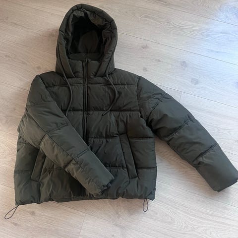 Pieces ytterjakke for dame i størrelse S. Jakken er brun/olivengrønn og laget i polyester. Modellen er en myk, vattert, knelang jakke med hette og glidelåslukking foran. Den har lange ermer og sidelommer. Såvidt brukt.