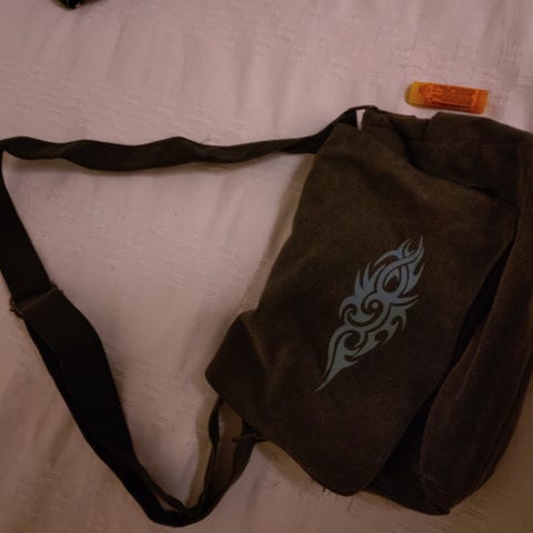 Stilig grå skulderveske med motiv. Laget av solid tekstil/canvas. Praktisk størrelse med god plass. I god stand. Se mål på bildene.