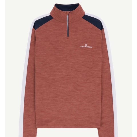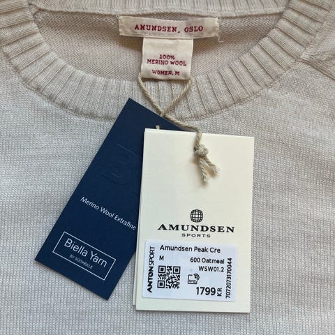 Amundsen genser for dame i størrelse M. Genseren er ribbestrikket i beige ull med kontrastfarget ribbekant i hals og mansjetter. Hoveddelen er laget av 100 % norsk ull, mens mansjettene er i 100 % merinoull. Produsert i Italia. Passer som varm og funksjonell hverdagsgenser eller mellomlag i kjøligere vær.