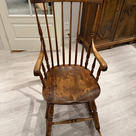 Gyngestol i tre i brun utførelse. Klassisk modell med høy rygg og spiler, buede armlener og med meier som gir gyngefunksjon. Passer til bruk innendørs, for eksempel i stue, lesehjørne eller på overbygd veranda, avhengig av plassering og vedlikehold av treverket.