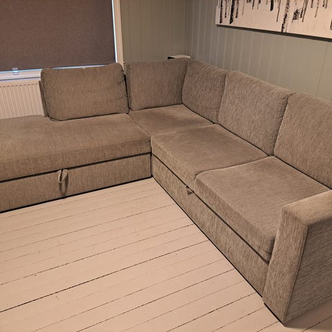 Sittekomforten er helt nydelig: faste, støttende puter – du synker ikke nedi som i mange billigsofaer, men sitter fortsatt mykt og godt. Ingen gjester har klaget på at den er for lav (sittehøyde 44 cm).