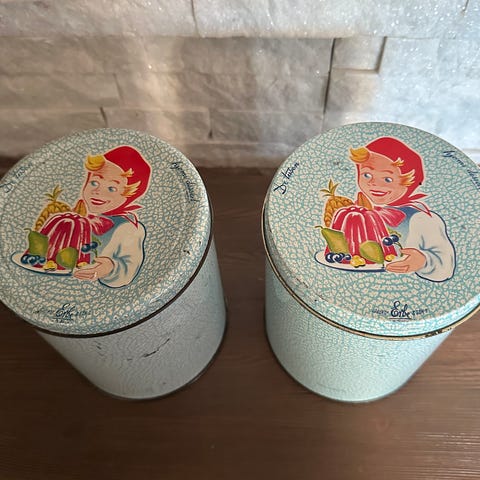 Selger vintage bokser til kaffe og gryn. 16 cm høye. 16 cm høyde, diameter 12,5 cm. pris pr. stk. Sender.