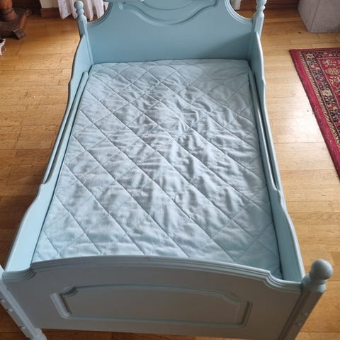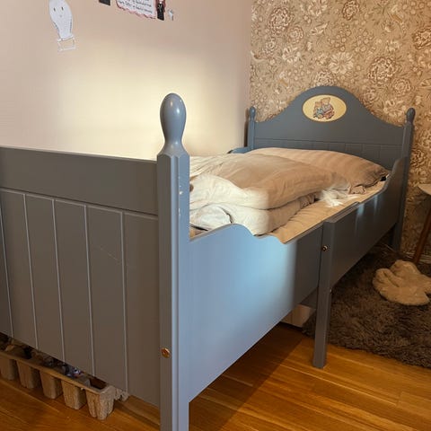 Flott barneseng med sjel. Passer til standard madrass for enkeltseng. Egnet til barnerom. Madrass følger ikke med!