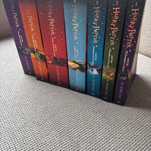J.K. Rowling Harry Potter bokserie i norsk språkdrakt. Bildene viser flere titler, blant annet «Harry Potter og De vises stein», «Harry Potter og Mysteriekammeret», «Harry Potter og Fangen fra Azkaban» og «Harry Potter og Ildbegeret». Bøkene er innbundet med illustrerte omslag. Egner seg som lesestoff for barn, ungdom og voksne som ønsker serien på norsk.