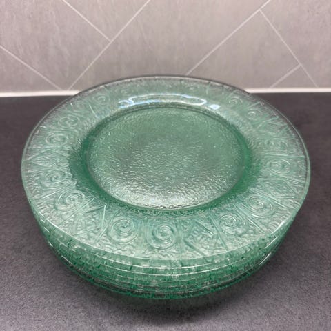 Selger 6 tefat i grønt glass. Dem er lite brukt. Har brukt dem som fat til tapas. Anchor Hocking Soreno avokado grønn, retro servise