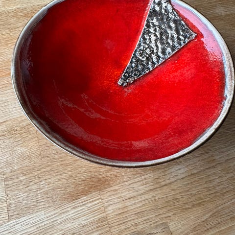 Firkantet bolle i keramikk med skrå sider. Innsiden har dekor i svart med rødt og hvitt mønster, utsiden er ensfarget mørk. Bollen kan brukes som serveringsbolle eller som dekorativt fat.