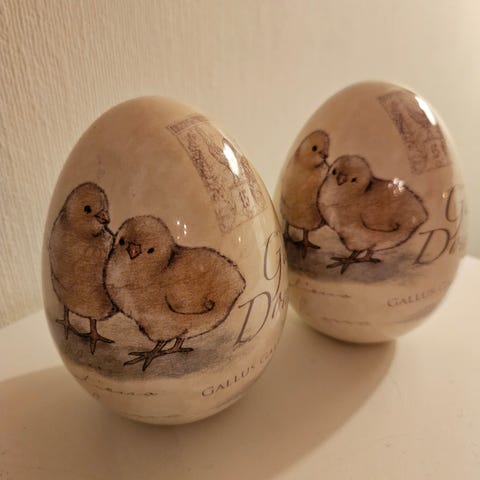 3 stk (1 stor, 2 små) pynte-påskeegg i porselen selges. Høyde på det store egget er 15 cm., de små er 9,5 cm høye. Det store har noe krakelering i glasuren, se bilde. Må hentes, sender ikke.