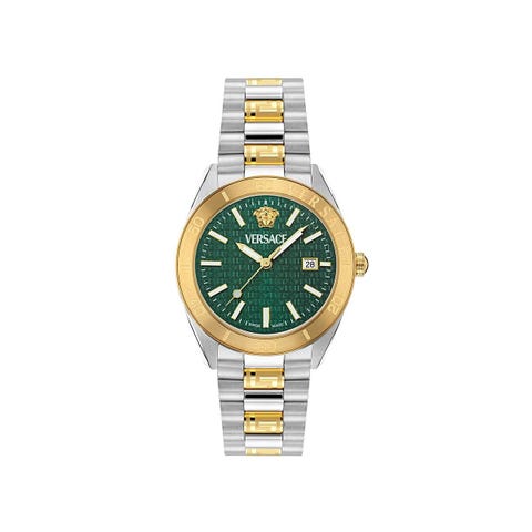 Timex herreklokke med blå urskive og dag-/datovisning. Klokken har rund kasse med metallfarget finish og en ytre ring i gullfarget tone. Timeindeksene er markert med sølvfargede streker, og viserne er enkle og lettleselige. Lenken er i sølvfarget stål med klassisk mønster. Analog visning med krone på høyre side for justering av tid, dag og dato. Passer som hverdagsklokke til herre.