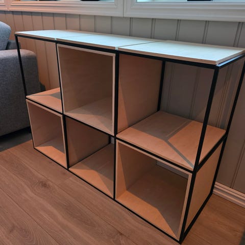 Vi selger vårt hyllesystem fra Muuto, fra den modulbaserte Stacked-serien. Systemet består av separate moduler som festes sammen med de hvite klemmene, slik at hyllene står stabilt og som én helhet.