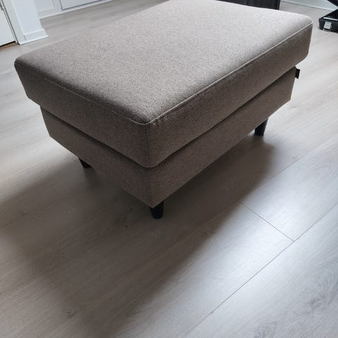 Jysk sittebenk med oppbevaring i grått tekstiltrekk. Benken har polstret sete med knappestikninger og rette sider. Under lokket er det et oppbevaringsrom som egner seg til for eksempel puter, pledd eller annet tilbehør. Ben i tre gir benken et enkelt og nøytralt uttrykk som passer i gang, stue eller soverom.