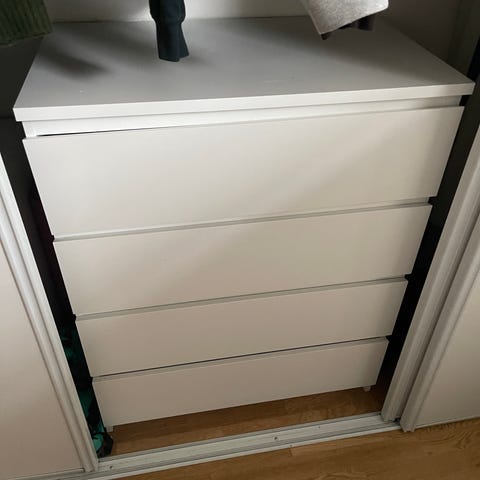 Malm kommode fra IKEA. Godt brukt, har flere bruksmerker (se bilde). Mangler en planke del mellom skuff 2 og 3 som gjør at man kan se inn i skuffen. Ellers fungerer de som normalt.😊