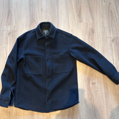Matinique Madamo overskjorte/skjortejakke for herre i størrelse XL. Jakken er mørkeblå og laget av 100 % polyester. Modellen har klassisk skjortekrage, knappelukking foran og to store brystlommer med klaff. Rett passform og enkel rygg uten detaljer. Stoffet har en myk, filtaktig overflate. Egnet som lett ytterjakke eller tykk overskjorte i overgangssesonger. Vask- og vedlikeholdsinformasjon står på innsydd vaskelapp.
