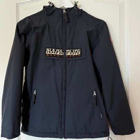 Napapijri jakke for barn i størrelse 152. Jakken er beige og laget i Gore-Tex-materiale. Modellen har hette, stor frontlomme med klaff og glidelås, samt justering i livet. Mansjettene har innvendig stramming. Unisex-passform som passer både gutter og jenter. Egnet som ytterjakke i vått og vindfullt vær. Fleece for som gjør den varm. Dessverre litt av foret inni den ene armen som har revnet litt. Se bilde.