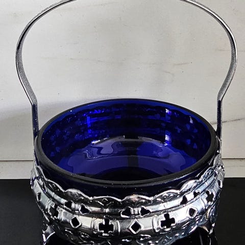 Koboltblå glasskål som ligger i en metallkurv på stett.
