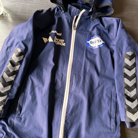 Nordstrand IF Hummel fotballjakke for barn i størrelse 128. Jakken har hette, glidelås i front og elastikk ved ermeåpningene. Fargekombinasjon blå og grå.