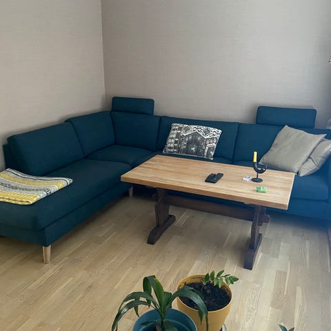 Sofaen er en modulsofa, men kan kun settes sammen slik den står på bildene.