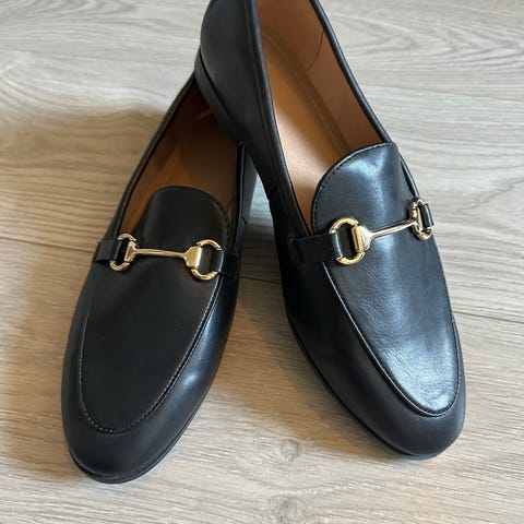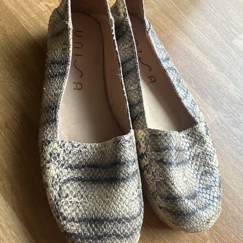 Sort UNISA skinn mokasin med sølv dekor i front med hvit hel såle.Høyden på sålen bak er 4 cm- Foran ved tå er sålen 2,5 cm. Skoen har mykt skinn.