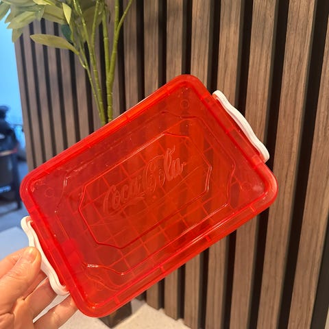 Vintage Coca-Cola flaskekasse i rød plast. Kassen har inndelte rom til flasker og bærehåndtak på sidene.