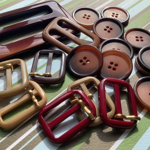 Vintage beltespenner i ulike plastmaterialer. Modellene er med to spalter for regulering av bånd eller remmer. Størrelsesforhold vises mot linjal på bildene for omtrentlig mål. Se bilder for mer informasjon.