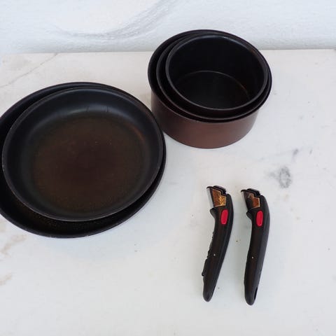 Selger et praktisk kjelesett fra Tefal Ingenio-serien med avtakbart håndtak. Kjelene og pannene kan stables, noe som sparer mye plass i skapet.