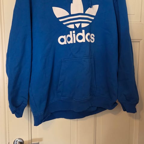 Adidas hettegenser for herre i størrelse L. Genseren er blå med stor Adidas-logo på brystet. Materiale ifølge lapp: hovedmateriale 70 % bomull og 30 % polyester. Hettegenseren har snøring i hetten og kengurulomme foran. Passer til hverdagsbruk og fritidsaktiviteter.