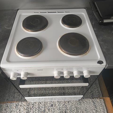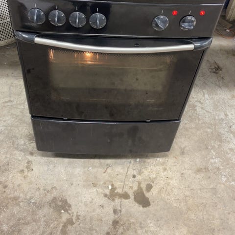Logik keramisk komfyr i hvit utførelse. Komfyren har keramisk topp med flere kokesoner og stekeovn med glassdør. På bildene vises et hakk/skade i emaljen på fronten over knottene, som er kun en skjønnhetsfeil.