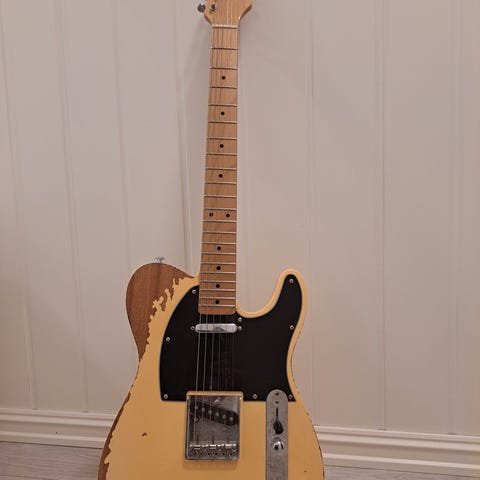 Elektrisk gitar i gul finish med kropp i klassisk Telecaster-form med sort plekterbrett. Gitaren er i god stand og passer utmerket til nybegynnere eller middels erfarne gitarister. Bare ta kontakt om du er interessert eller lurer på noe:)